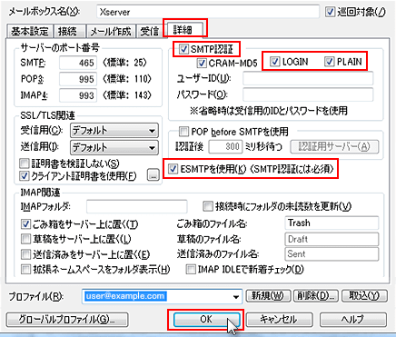 「SMTP認証」「LOGIN」「PLAIN」「ESMTPを使用」にチェックをいれ、「OK」をクリックします。