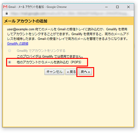 メールアドレスを確認し、「他のアカウントからメールを読み込む(POP3)」を選び、【次へ】をクリックしてください。