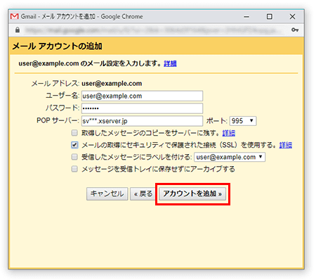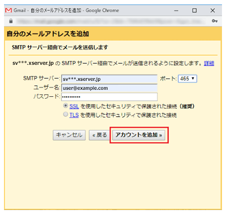 下記を参考に情報を入力し【アカウントを追加】をクリックしてください。