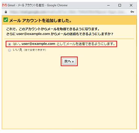 該当のメールアドレスでメールの送信も行う場合は【はい。xx@xxxとしてメールを送信できるようにします】にチェックを入れ【次へ】をクリックしてください。