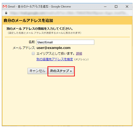 下記を参考に「名前」を任意で入力し、【エイリアスとして扱います】にはチェックを入れずに【次のステップ】をクリックしてください。