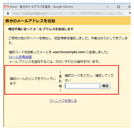 設定中の該当メールアドレス宛に、Gmailより認証メールが届きます。届いたメールに記載されている「確認コード」を入力するか、メール内のリンクをクリックし、認証を完了してください。