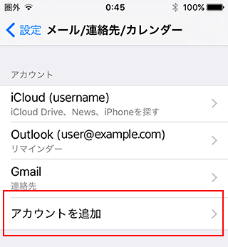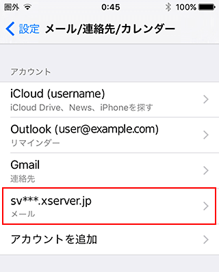 設定メニューから『メール/連絡先/カレンダー』を開き、先ほど追加したアカウントをタップしてください。