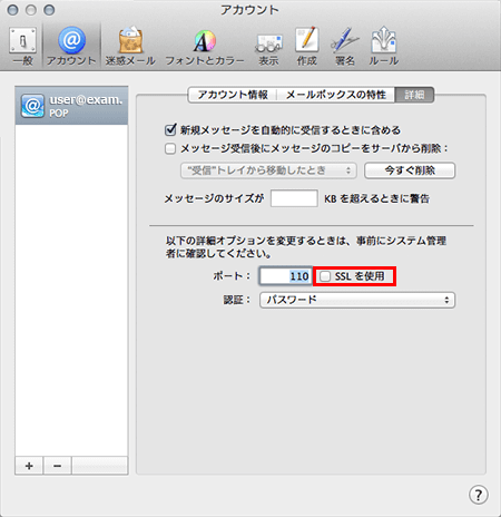 「SSLを使用」のチェックを外し、ポートを「110」としてください。