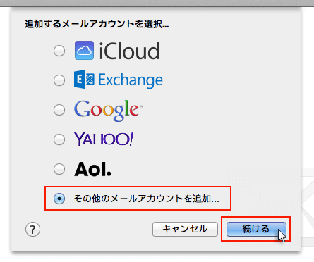 「その他のメールアカウントを追加…」を選択し、「続ける」をクリックしてください。
