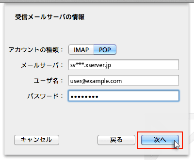 メールソフトの設定や下記を参考に情報を入力をし「次へ」をクリックしてください。