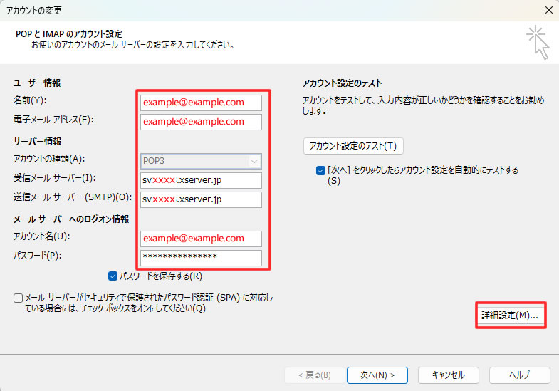 9. 入力情報はお渡ししている設定書類を見ながら赤枠内を変更する。その後「詳細設定」をクリック