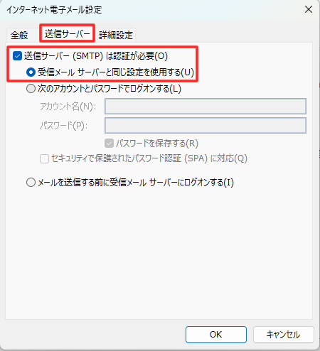 ※その下のラジオボタンは「受信メールサーバーと同じ設定を使用する」にチェックをいれます。