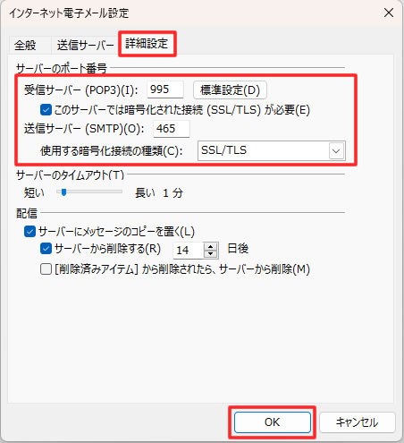 ・受信サーバー(POP3):995