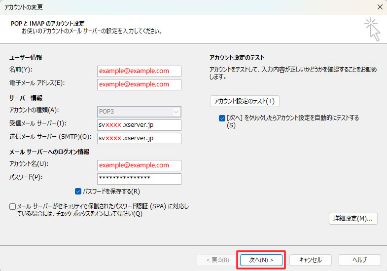 エラーが出る場合は、設定情報が間違っている可能性があります。 受信メールサーバー、送信メールサーバーのスペルミス、もしくはポート番号が正しく入力されているかご確認ください。