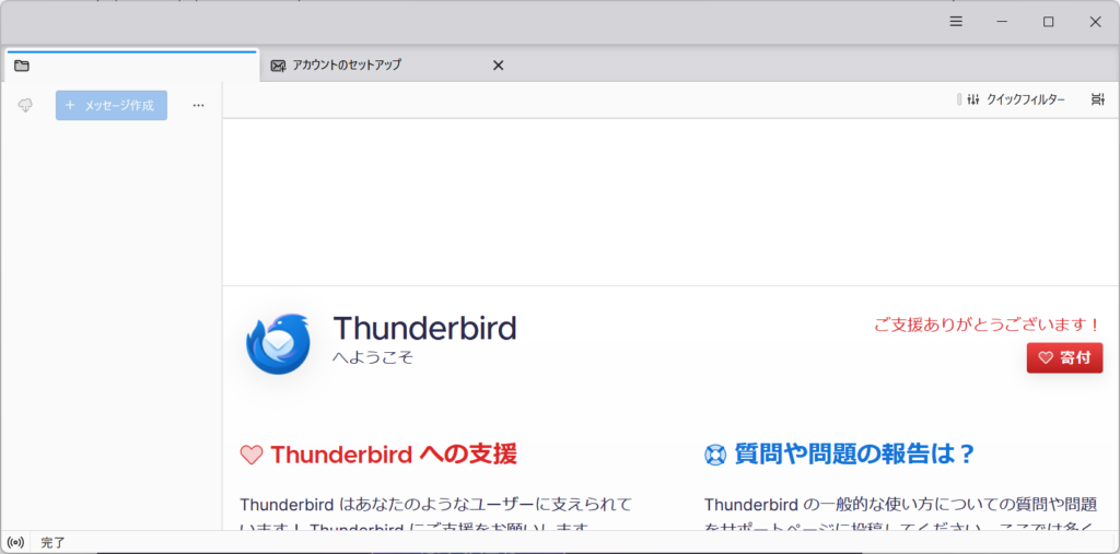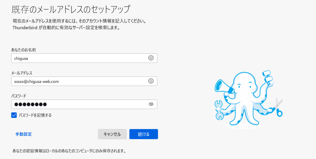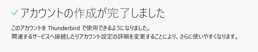 「続ける」ボタンをクリックすると、Thunderbirdが自動で設定情報を取得しますが、