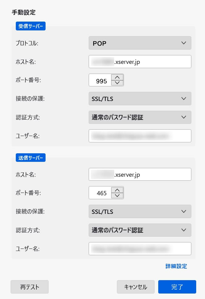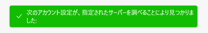 「再テスト」ボタンをクリックし、「次のアカウント設定が、指定されたサーバーを調べることにより見つかりました」と表示されたら完了ボタンをクリックします。