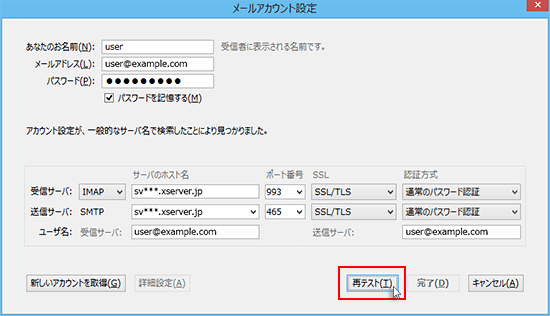 ポート番号など、入力項目の内容を今一度ご確認の上、問題がなければ画面右下の「再テスト」をクリックします。