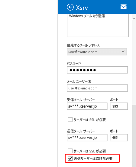 メールの送信と受信で同じユーザー名とパスワードを使う